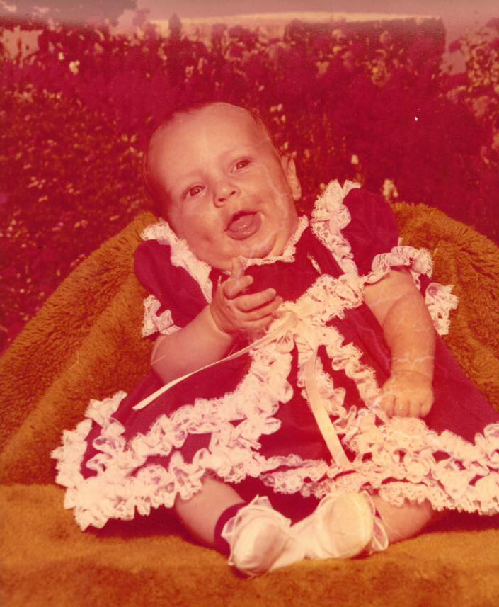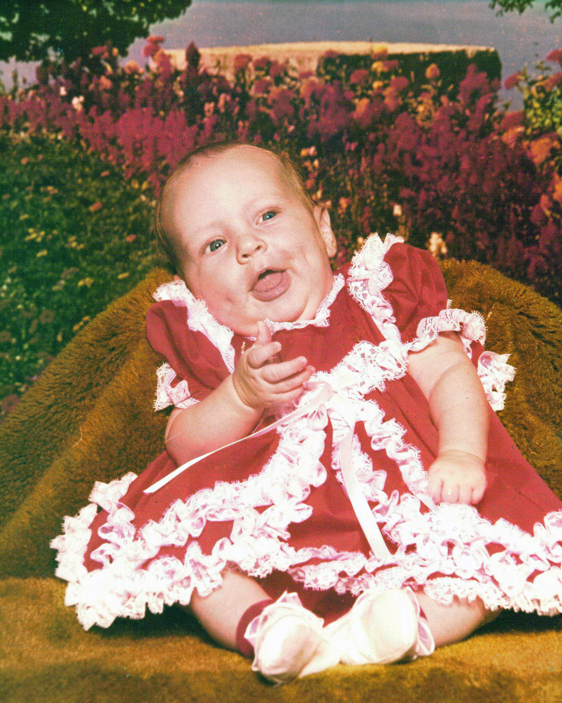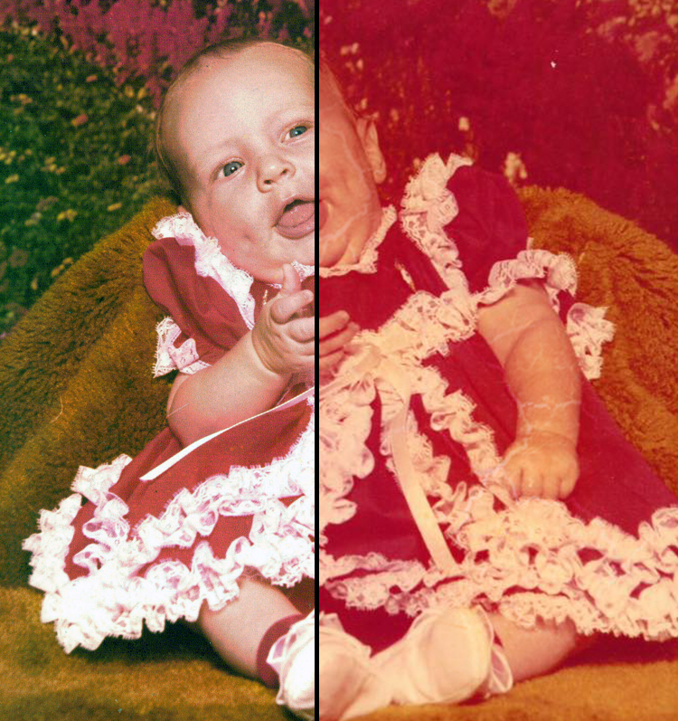 I was able to remove the water damage and enhance contrast overall. Utilizing filters I gave the sky a blue cast, the flowers a violet cast, and the vegetation a green cast. I also sharpened the baby's eyes.